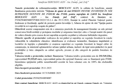 Comunicat de presă – Finalizare proiect: „Schema de ajutor de stat SPRIJIN PENTRU INVESTIȚII ÎN NOI SUPRAFEȚE OCUPATE DE PĂDURI din PNRR, pentru suprafața de 2,6018 ha, beneficiar BERCEANU ALIN – loc. Daneți , jud. Dolj „