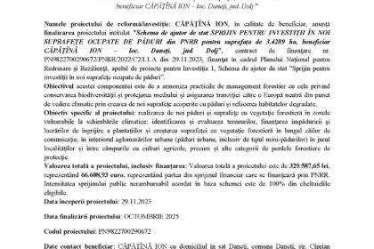 Comunicat de presă – Finalizare proiect: „Schema de ajutor de stat SPRIJIN PENTRU INVESTIȚII ÎN NOI SUPRAFEȚE OCUPATE DE PĂDURI din PNRR pentru suprafața de 3,4289 ha,beneficiar CĂPĂȚÎNĂ ION – loc. Daneți, jud. Dolj „