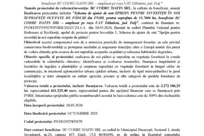 Comunicat de presă – Finalizare proiect: „Schema de ajutor de stat SPRIJIN PENTRU INVESTIȚII ÎN NOI SUPRAFEȚE OCUPATE DE PĂDURI din PNRR, pentru suprafața de 33,7604 ha, beneficiar BC CODRU DAFIN SRL – amplasat pe raza UAT Dăbuleni, jud. Dolj”