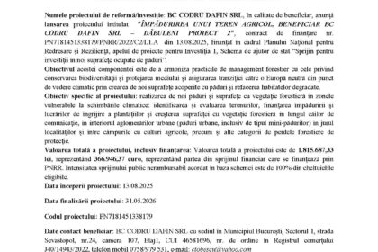 Comunicat de presă – „ PNRR: Fonduri pentru România modernă și reformată!”Lansare proiect: ” ÎMPĂDURIREA UNUI TEREN AGRICOL, BENEFICIAR BC CODRU DAFIN SRL – DĂBULENI PROIECT 2″
