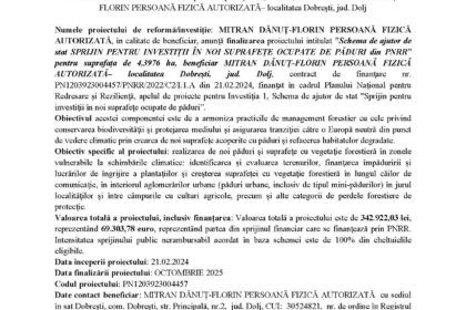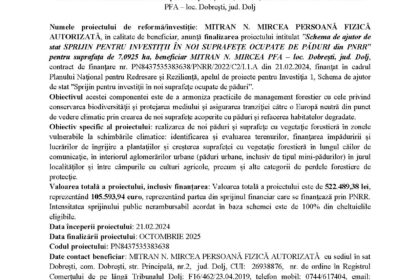 Comunicat de presă – „ PNRR: Fonduri pentru România modernă și reformată! ”Finalizare proiect: ‟Schema de ajutor de stat SPRIJIN PENTRU INVESTIȚII ÎN NOI SUPRAFEȚE OCUPATE DE PĂDURI din PNRR” pentru suprafața de 4,3976 ha, beneficiar MITRAN DĂNUȚ-FLORIN PERSOANĂ FIZICĂ AUTORIZATĂ– localitatea Dobrești, jud. Dolj