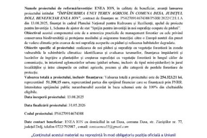 Comunicat de presă – „ PNRR: Fonduri pentru România modernă și reformată!” Lansare proiect: „ÎMPĂDURIREA UNUI TEREN AGRICOL ÎN COMUNA DESA, JUDEȚUL DOLJ, BENEFICIAR ENEA ION”