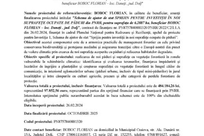 Comunicat de presă – Finalizare proiect: „Schema de ajutor de stat SPRIJIN PENTRU INVESTIȚII ÎN NOI SUPRAFEȚE OCUPATE DE PĂDURI din PNRR, pentru suprafața de 6,2887 ha, beneficiar BOBOC FLORIAN – loc. Daneți , jud. Dolj”