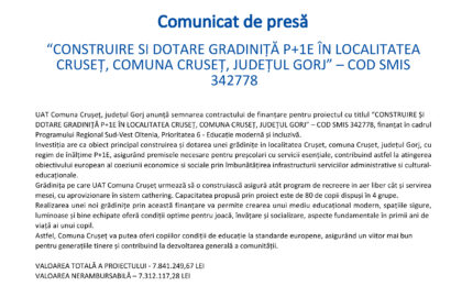 Comunicat de presă – „Construire și dotare grădiniță P+1E în localitatea Creseț, comuna Cruseț, județul Gorj”