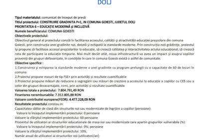 Comunicat de presă – CONSTRUIRE GRADINITA P+1, IN COMUNA GOIESTI, JUDETUL DOLJ