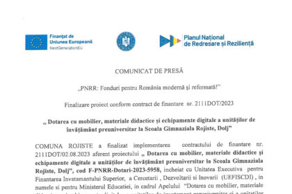 Finalizare proiect „Dotarea cu mobilier, materiale didactice și echipamente digitale a unităților de învățământ preuniversitar la școala gimnazială Rojiște, Dolj”