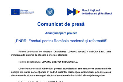 Anunț începere proiect „Dezvoltarea LUKAND ENERGY STUDIO S.R.L. prin instalarea de sisteme de stocare a energiei electrice”