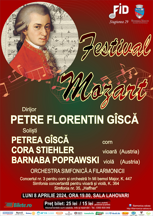 FESTIVAL MOZART – luni, 8 aprilie 2024, ora 19.00, Sala Lahovari – Filarmonica „Ion Dumitrescu” Rm. Vâlcea