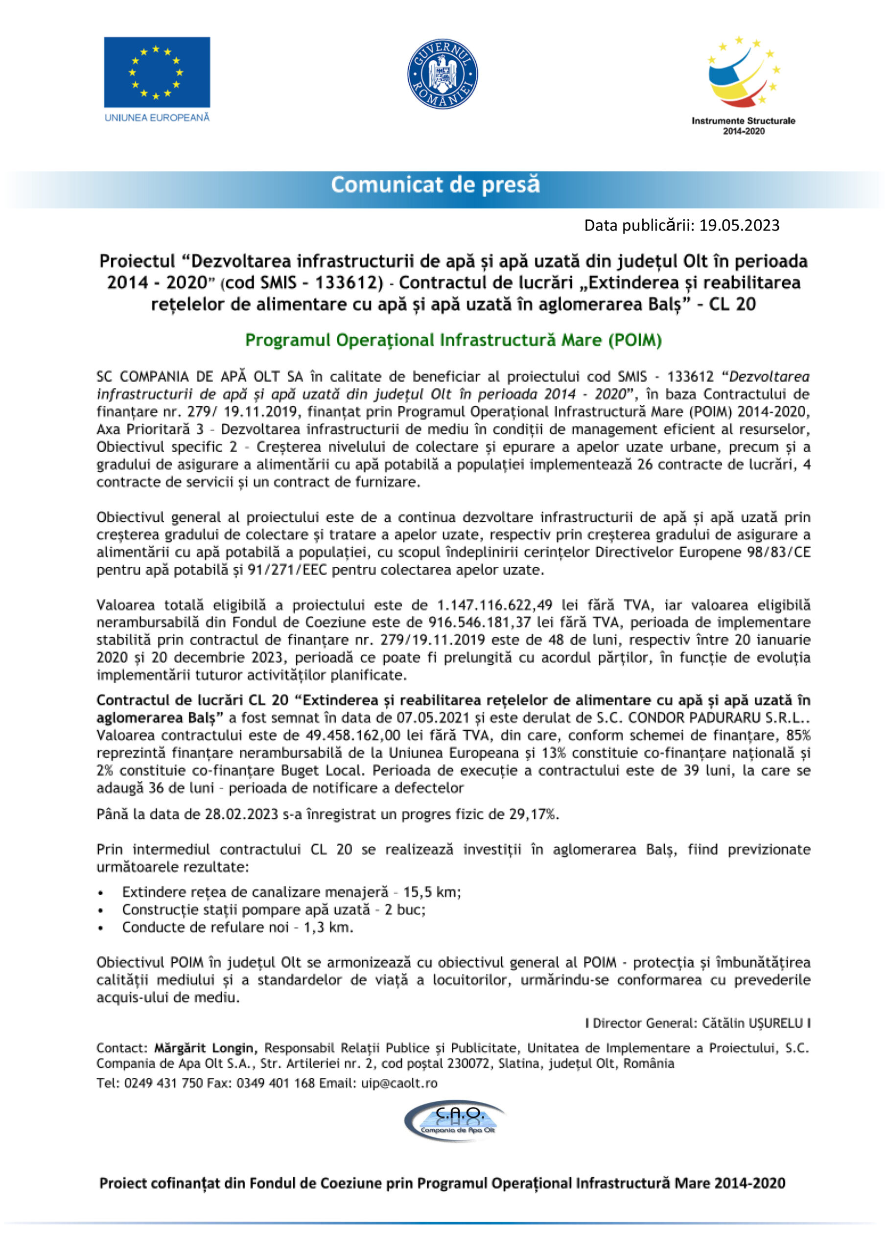 Proiectul „Dezvoltarea infrastructurii de apă și apă uzată din județul Olt în perioada 2014 – 2020” (cod SMIS – 133612) – Contractul de lucrări „Extinderea și reabilitarea rețelelor de alimentare cu apă și apă uzată în aglomerarea Balș” – CL 20