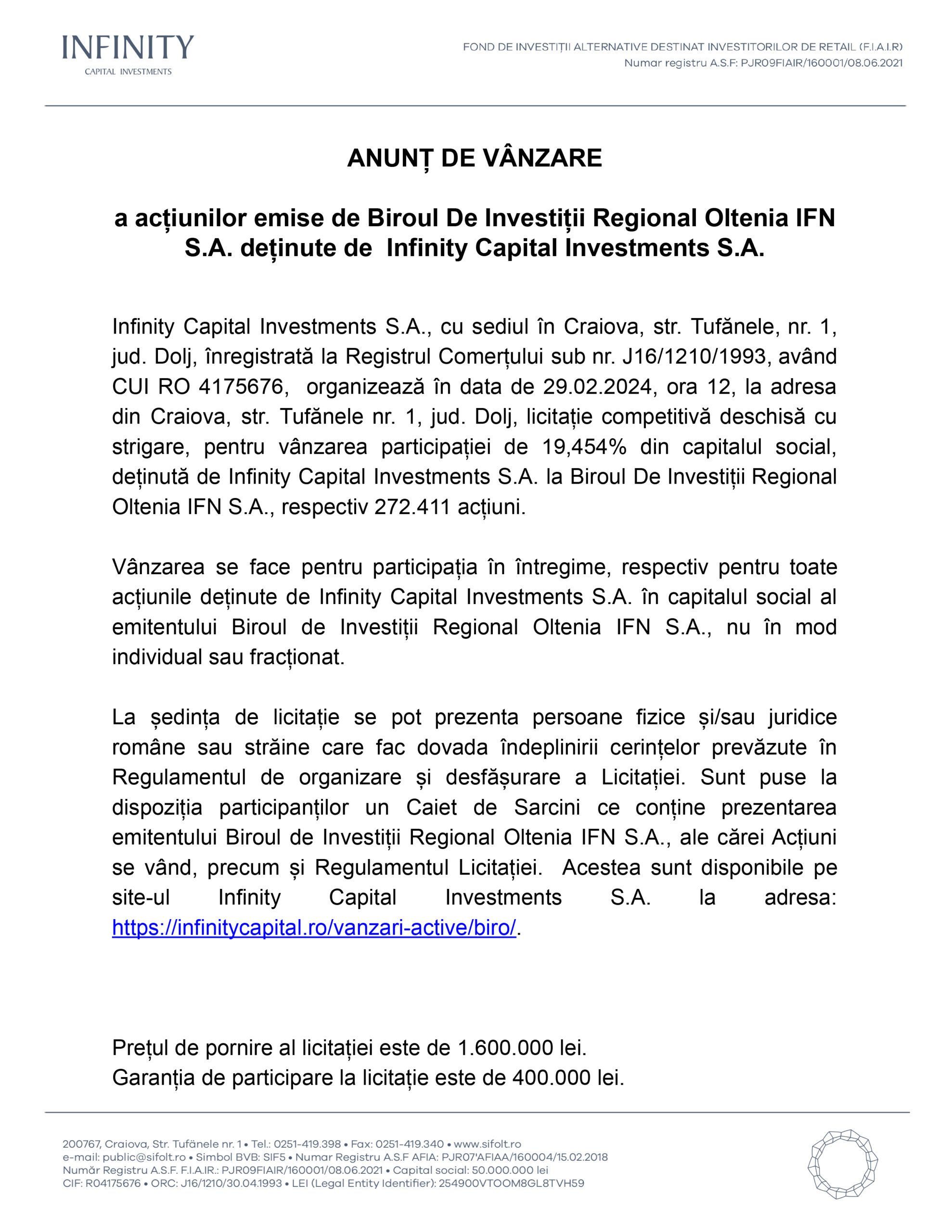 ANUNȚ DE VÂNZARE a acțiunilor emise de Biroul De Investiții Regional Oltenia IFN S.A. deținute de Infinity Capital Investments S.A.