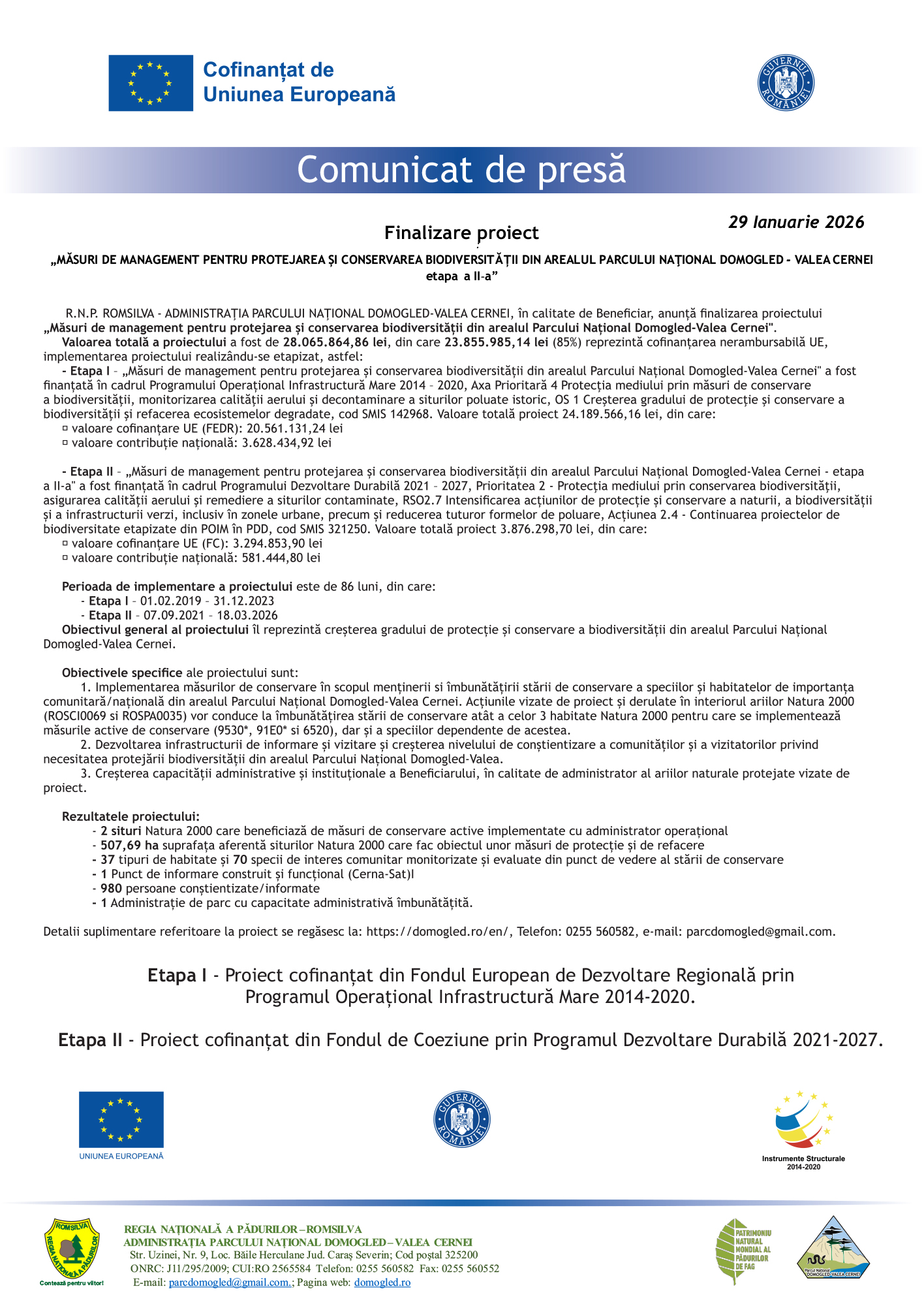 Finalizare proiect: „MĂSURI DE MANAGEMENT PENTRU PROTEJAREA ȘI CONSERVAREA BIODIVERSITĂȚII DIN AREALUL PARCULUI NAŢIONAL DOMOGLED – VALEA CERNEI, etapa a II-a”