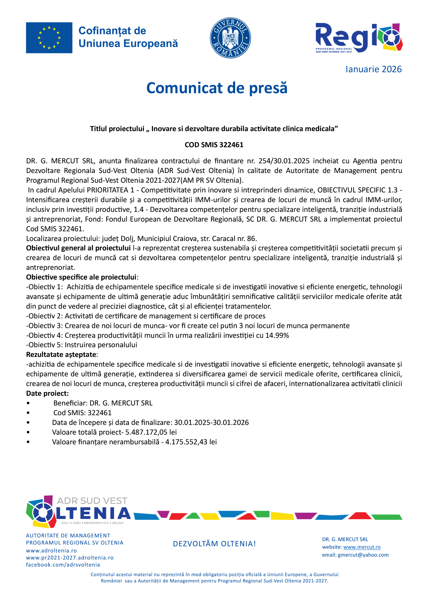 DR. G. MERCUT SRL, anunta finalizarea contractului de finantare nr. 254/30.01.2025 incheiat cu Agentia pentruDezvoltare Regionala Sud-Vest Oltenia (ADR Sud-Vest Oltenia) în calitate de Autoritate de Management pentruProgramul Regional Sud-Vest Oltenia 2021-2027(AM PR SV Oltenia). In cadrul Apelului PRIORITATEA 1 – Competitivitate prin inovare si intreprinderi dinamice, OBIECTIVUL SPECIFIC 1.3 – Intensificarea creșterii durabile și… Continuă lectura Comunicat de presă – Titlul proiectului „Inovare si dezvoltare durabila activitate clinica medicala”. COD SMIS 322461