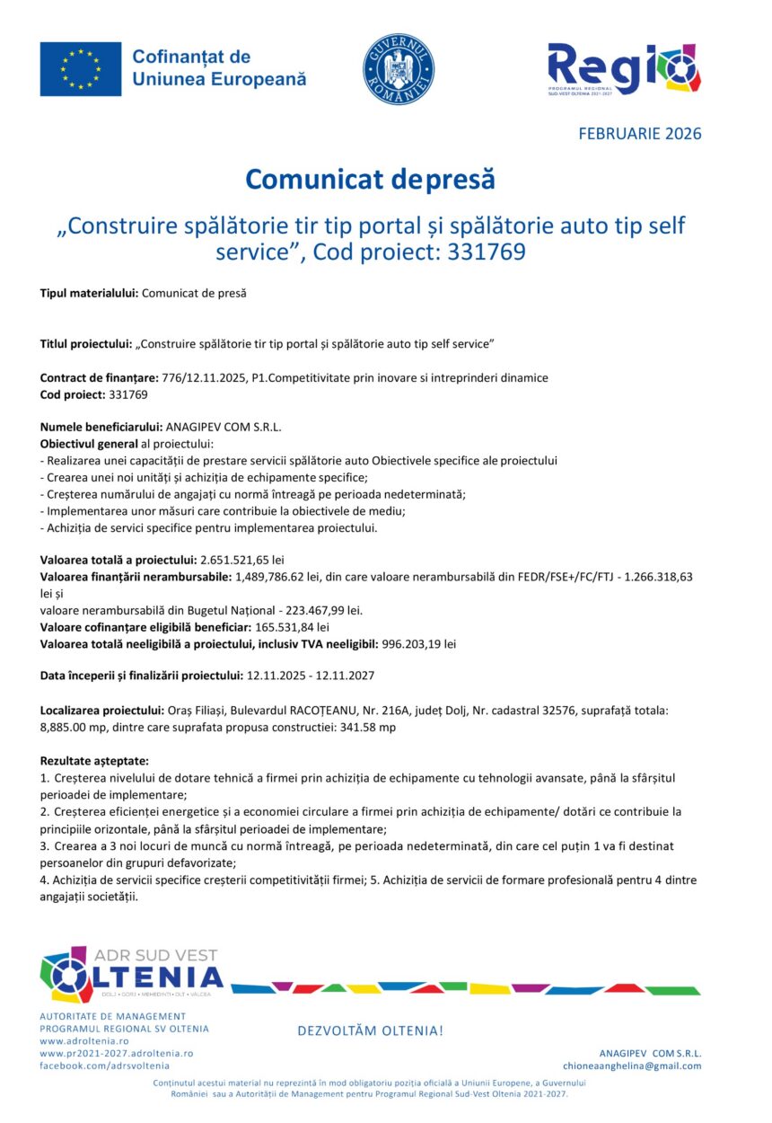 Comunicat de presă – „Construire spălătorie tir tip portal și spălătorie auto tip self service”, Cod proiect: 331769