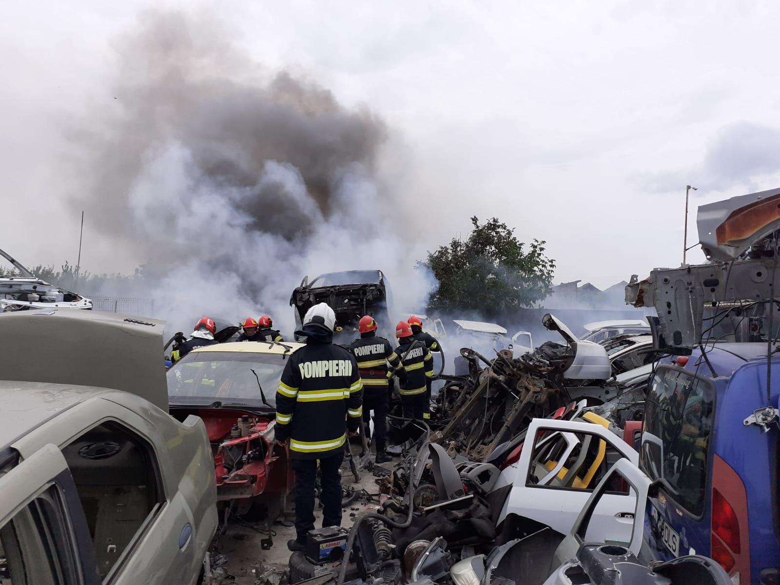 VIDEO/ Incendiu la un parc de dezmembrări auto, în Craiova