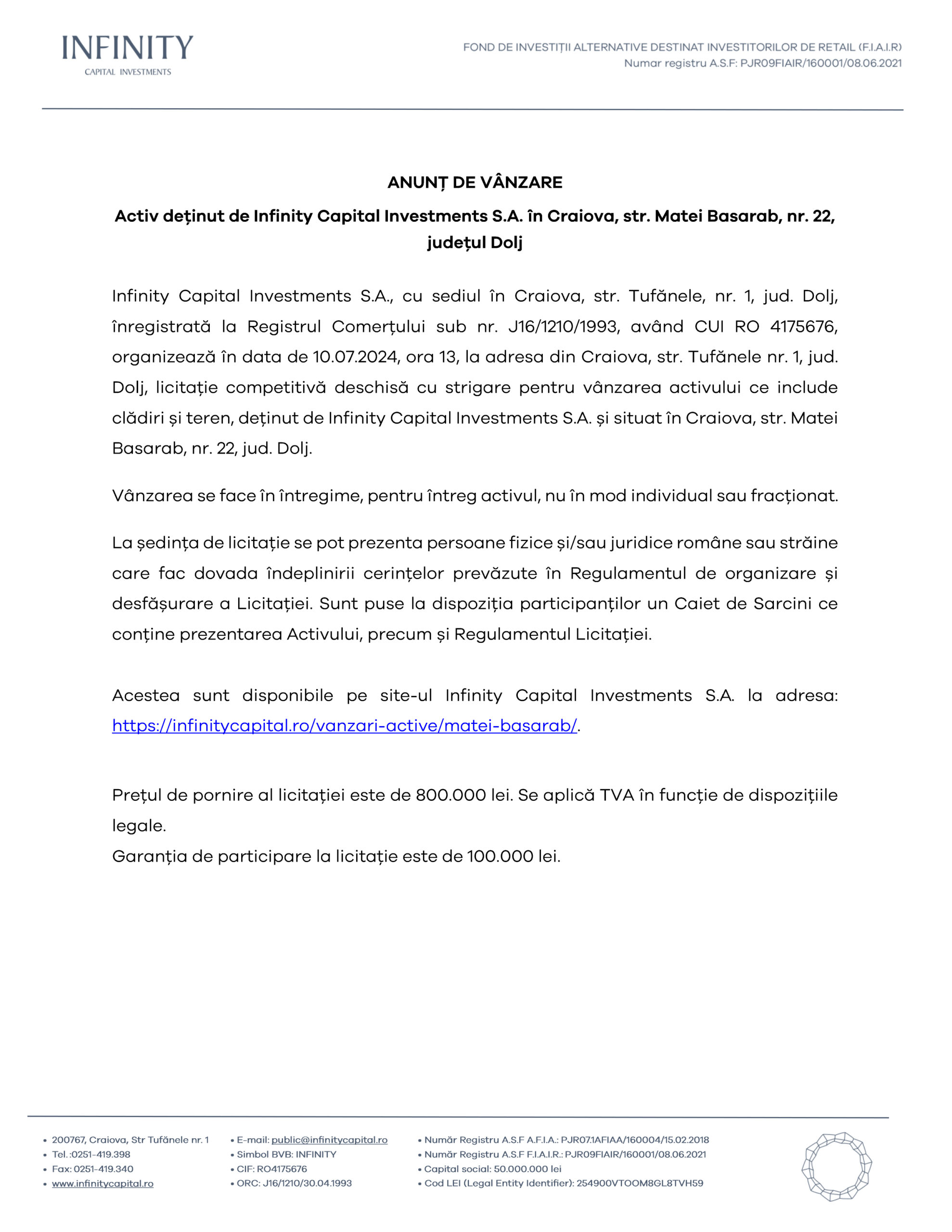 ANUNȚ DE VÂNZARE – Activ deținut de Infinity Capital Investments S.A. în Craiova, str. Matei Basarab, nr. 22, județul Dolj