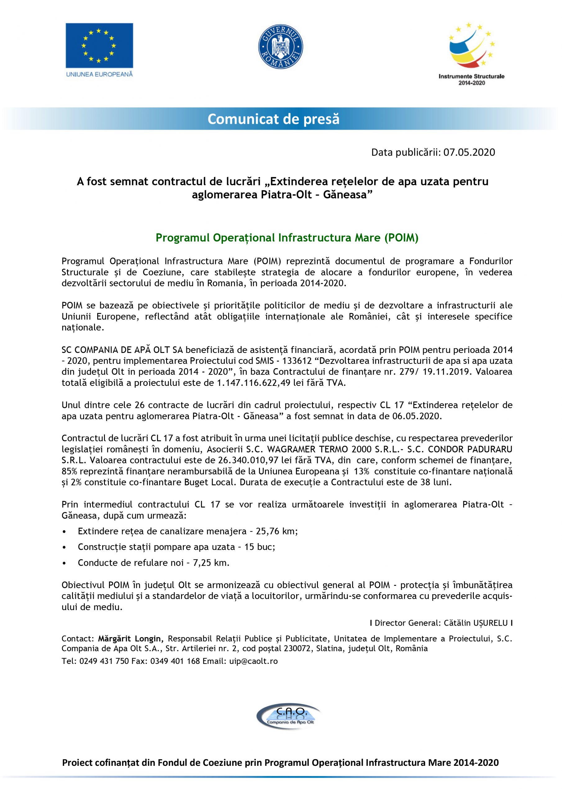 A fost semnat contractul de lucrări „Extinderea rețelelor de apă uzată pentru aglomerarea Piatra-Olt – Găneasa”