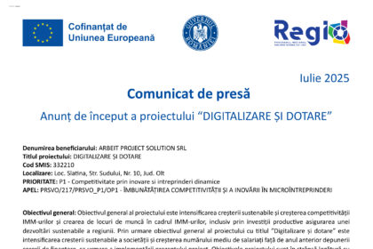 Comunicat de presă Anunț de început a proiectului “DIGITALIZARE ȘI DOTARE” – ARBEIT PROJECT SOLUTION SRL