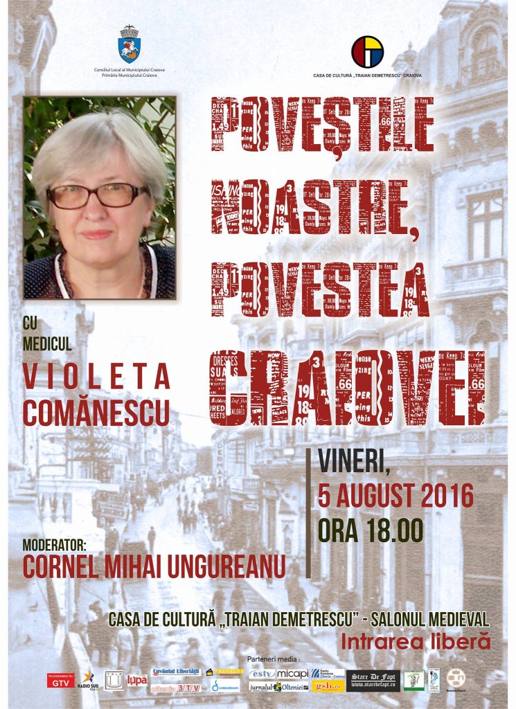 Casa de Cultură „Traian Demetrescu” organizează vineri, 5 august 2016, de la ora 18.00, o nouă întâlnire din cadrul proiectului „Poveștile noastre, povestea Craiovei”. Invitată este medicul Violeta Comănescu, care va depăna povești despre Craiova de altădată, așa cum a cunoscut-o, despre anii de școală, de adolescență și de maturitate, despre condițiile în care se practica medicina înainte de 1989 și cum funcționează sistemul acum, despre felul în care a evoluat orașul în diferite perioade de timp. La finalul întâlnirii, Violeta Comănescu va dialoga cu cei interesați. Moderator: Cornel Mihai Ungureanu. Intrarea este liberă.
