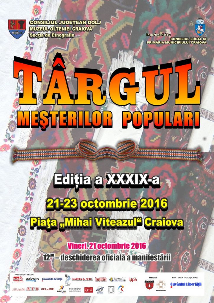 Muzeului Olteniei, Secţia de Etnografie – ”Casa Băniei”, cu sprijinul financiar al Consiliului Judeţean Dolj, şi, în parteneriat, cu Consiliul Local și Primăria Municipiului Craiova, organizează în perioada 21 – 23 octombrie a.c., în Piața Mihai Viteazul, cea de-a XXXIX-a ediţie a Târgului Meşterilor Populari, manifestare culturală dinamică ce oferă vizitatorilor ocazia de a regăsi frumuseţea obiectelor unui patrimoniu ţărănesc excepţional şi mărturia gestului firesc şi sacru de reîntoarcere la meşteşug.