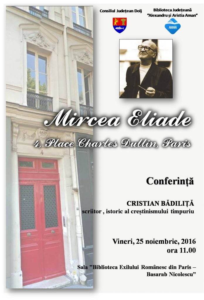 Dată fiind importanța materialelor dactilografiate de Mircea Eliade, Biblioteca Județeană “Alexandru și Aristia Aman” organizează vineri, 25 noiembrie, un dublu eveniment cultural. Începând cu ora 11.00 vă invităm să audiați conferința cu titlul Mircea Eliade 4, Place Charles Dullin, Paris, susținută de dr. Cristian Bădiliță, istoric al creștinismului timpuriu, eseist și poet român. Evenimentul se va desfășura în sala “Biblioteca Exilului Românesc din Paris – Basarab Nicolescu”.