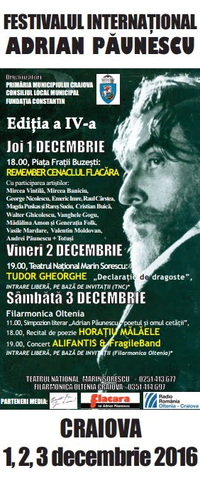 Festivalul Internaţional Adrian Păunescu, ajuns la cea de-a patra ediţie, va avea loc la Craiova, în zilele de 1, 2 şi 3 decembrie 2016. Organizatorii ediţiei din acest an sunt: Primăria Municipiului Craiova şi Consiliul Local Municipal, în parteneriat cu Fundaţia Constantin.