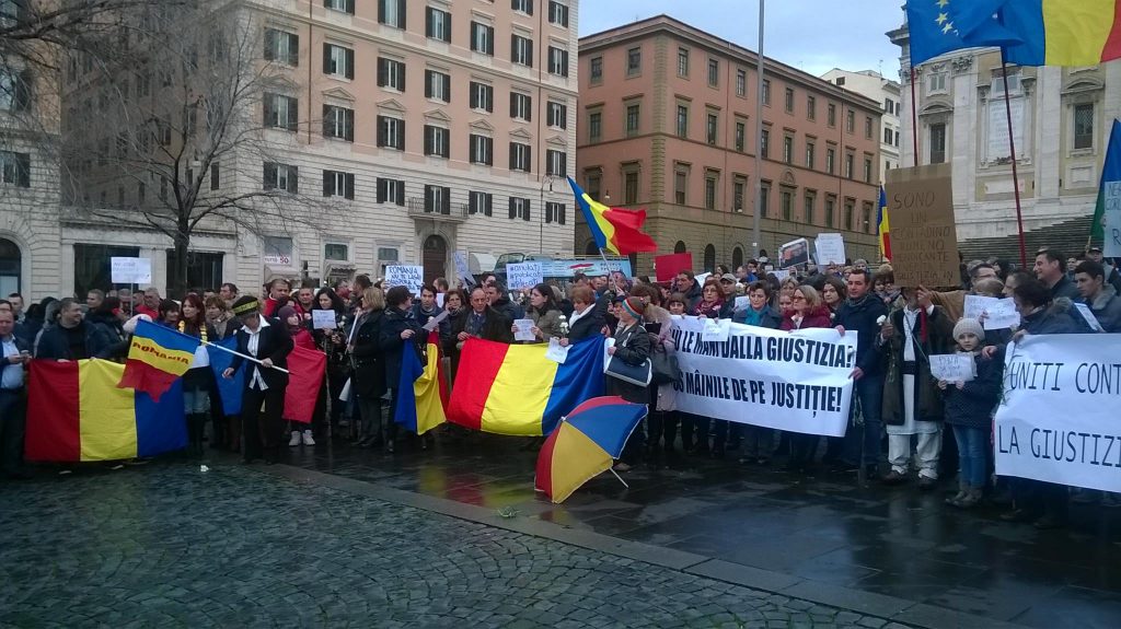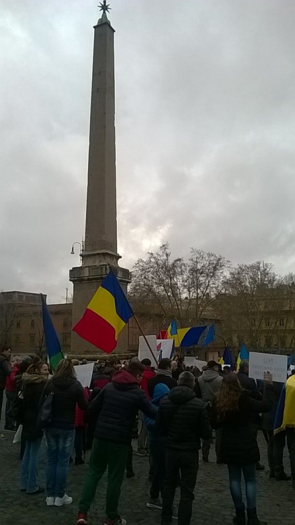 Aproximativ 400 de români protestează, în apropierea gării Termini, pe platoul din spatele bisericii Santa Maria Maggiore, transmite corespondentul “Jurnalul Olteniei” la Roma, Petre Cojocaru.