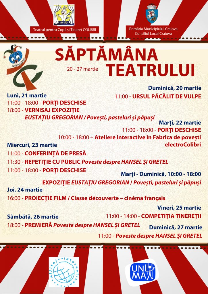 Săptămâna Teatrului la Craiova a celebrat cele trei mari sărbători: Ziua Internaţională a Teatrului pentru copii şi tineret – 20 martie, Ziua Mondială a Marionetiştilor şi Păpuşarilor – 21 martie şi Ziua Mondială a Teatrului – 27 martie, prin spectacole, ateliere de creație, expoziții de scenografie, de fotografie, de pictură murală, a mediat dialoguri între oamenii teatrului și autorități, cadre didactice, elevi și studenți, scriitori, voluntari.
