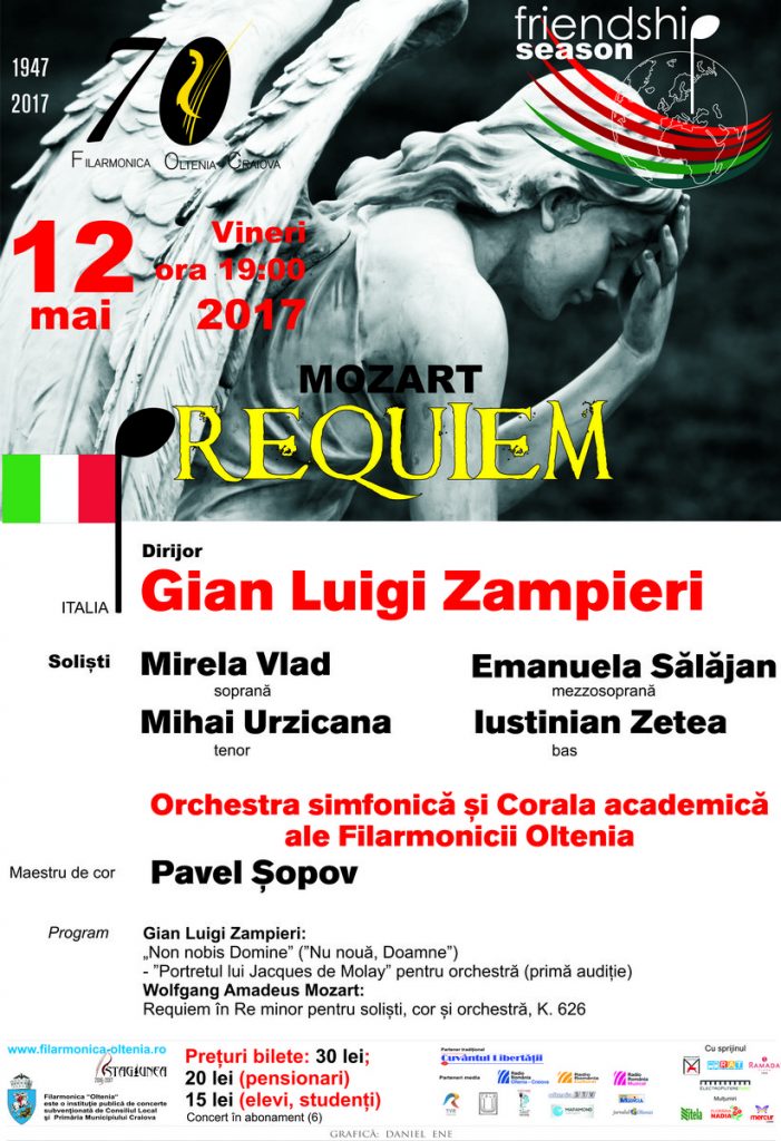 Requiem-ul mozartian, o ultimă mărturie a geniului şi sensibilităţii marelui compozitor, reprezintă o pagină unică în istoria muzicii prin complexitatea facturii şi valoarea universală a emoţionantul mesaj transmis. Povestea acestei capodopere debutează în luna iulie a anului 1791, când i s-a comandat lui Mozart, prin intermediul unui mesager necunoscut care i-a oferit un onorariu de 50 de ducaţi, o „missă funebră“. Datorită îndelungatelor cercetări efectuate de remarcabilul exeget al creaţiei mozartiene Bernhard Paumgartner, astăzi cunoaştem întreaga derulare a evenimentelor. Mesagerul misterios era de fapt intendentul contelui Franz von Walsegg-Stuppach, care obişnuia să achiziţioneze diverse lucrări pentru „a accede” el însuşi la statutul de compozitor (Recviemul era destinat ceremoniei comemorative anuale a soţiei sale). De altfel, a existat şi o audiţie a Recviemului sub bagheta contelui, acestuia fiindu-i atribuită şi muzica (14 decembrie 1793), dar în timp paternitatea lucrării a fost restabilită. Mozart nu a finalizat integral structura lucrării, partitura fiind completată de un elev al său – Franz Xaver Süssmayer (1766 – 1803) – care s-a bazat în demersul său pe îndrumările şi schiţele lăsate de maestru.