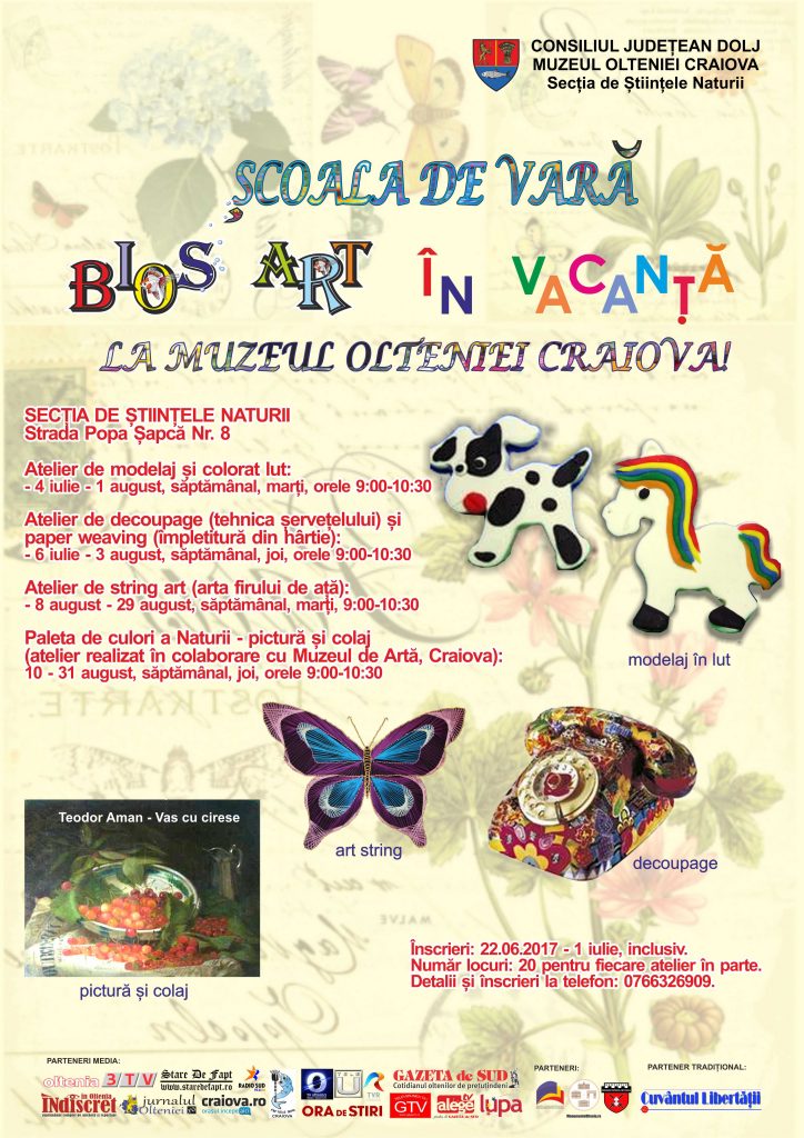- Secția de Științele Naturii organizează patru ateliere creative în cadrul Școlii de Vară ”Bios Art în vacanță” abordând următoarele tehnici:atelier de modelaj și colorat lut (perioada, 4 iulie-1 august), se va derula săptămânal marțea, în intervalul orar 09.00 – 10.30; atelier de decoupage (tehnica șervețelului) și paper weaving -împletitură din hartie (perioada, 6 iulie – 3 august), se va derula săptămânal, joia, în intervalul orar 09.00 – 10.30; atelier de string art/arta firului de ață, (perioada 8 – 29 august), se va derula săptămânal, marțea, în intervalul orar 09.00 – 10.30; atelierul „Paleta de culori a Naturii – pictură și colaj”(realizat în colaborare cu Muzeul de Artă Craiova, în perioada 10 – 31 august), se va derula săptămânal, joia, în intervalul orar 09.00 – 10.30. Specialistul din partea Muzeului de Artă Craiova care îi va îndruma pe cei mici în lumea culorilor și a artei, este muzeograf Rusalia Crăciunoiu.