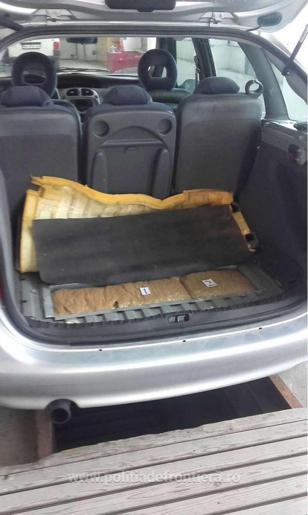În urma scanării, în spațiul special amenajat din portbagaj au fost descoperite 4 colete, ce conțineau cantitatea totală de 2,81 kg marijuana”, potrivit Poliției de Frontieră Dolj.
