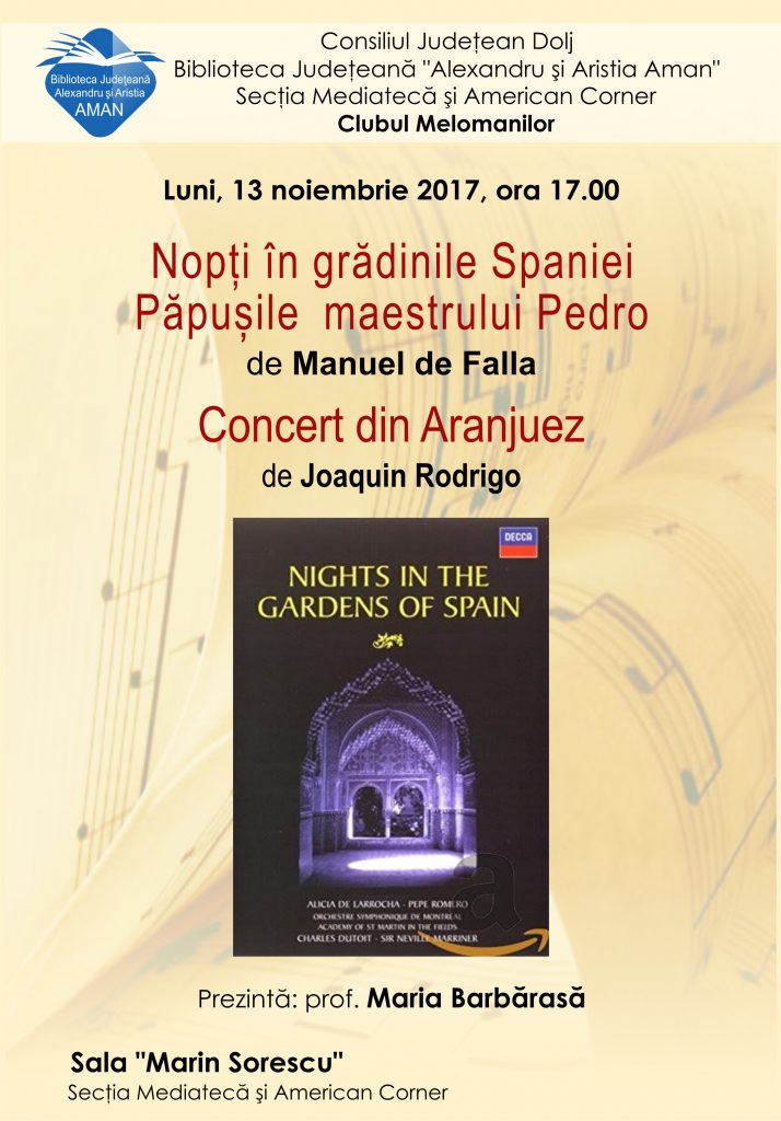 Pentru întâlnirea de la bibliotecă au fost selectate trei lucrări muzicale. “Nopți în grădinile Spaniei” și “Păpușile maestrului Pedro”, adaptare muzicală și scenică după un episod din “Don Quijote de la Mancha”.