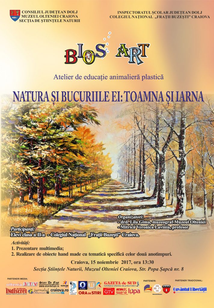 Miercuri, 15.11.2017, ora 13.30, la Secția de Științele Naturii a Muzeului Olteniei Craiova, atelierele de creație animalieră plastică Bios Art vor găzdui elevii de la clasa a II-a de la Colegiul Național Frații Buzești.