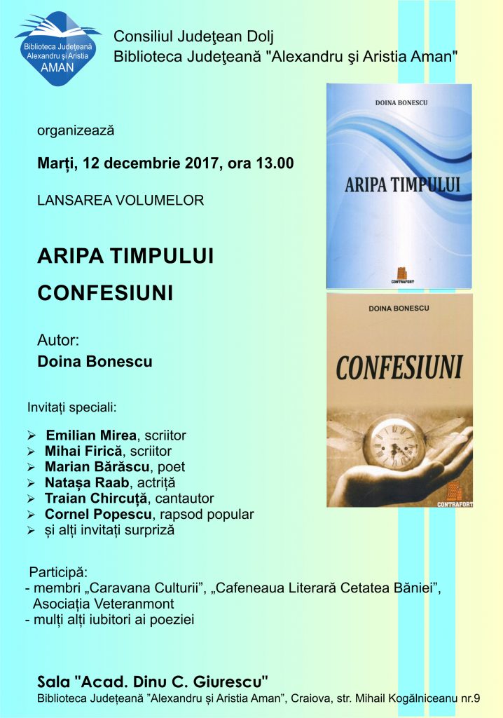 Biblioteca Județeană “Alexandru și Aristia Aman” organizează marți, 12 decembrie 2017, începând cu ora 13.00, lansarea volumelor de versuri „Aripa timpului”, „Confesiuni”, autor Doina Bonescu.