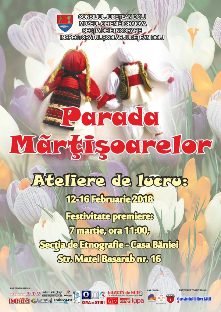 Muzeul Olteniei Craiova – Secția de Etnografie, în colaborare cu Inspectoratul Școlar Județean Dolj și cu sprijinul financiar al Consiliului Județean Dolj, organizează în ziua de 7 martie a.c., ora 11.00, la sediul secției din str. Matei Basarab nr. 16, vernisajul Expoziţiei temporare “Parada Marţişoarelor – Ediția a X-a”, în cadrul căreia vor fi etalate peste 70 de panouri cu mărțișoare tradiționale realizate de către participanții la atelierele de creație ale instituției.