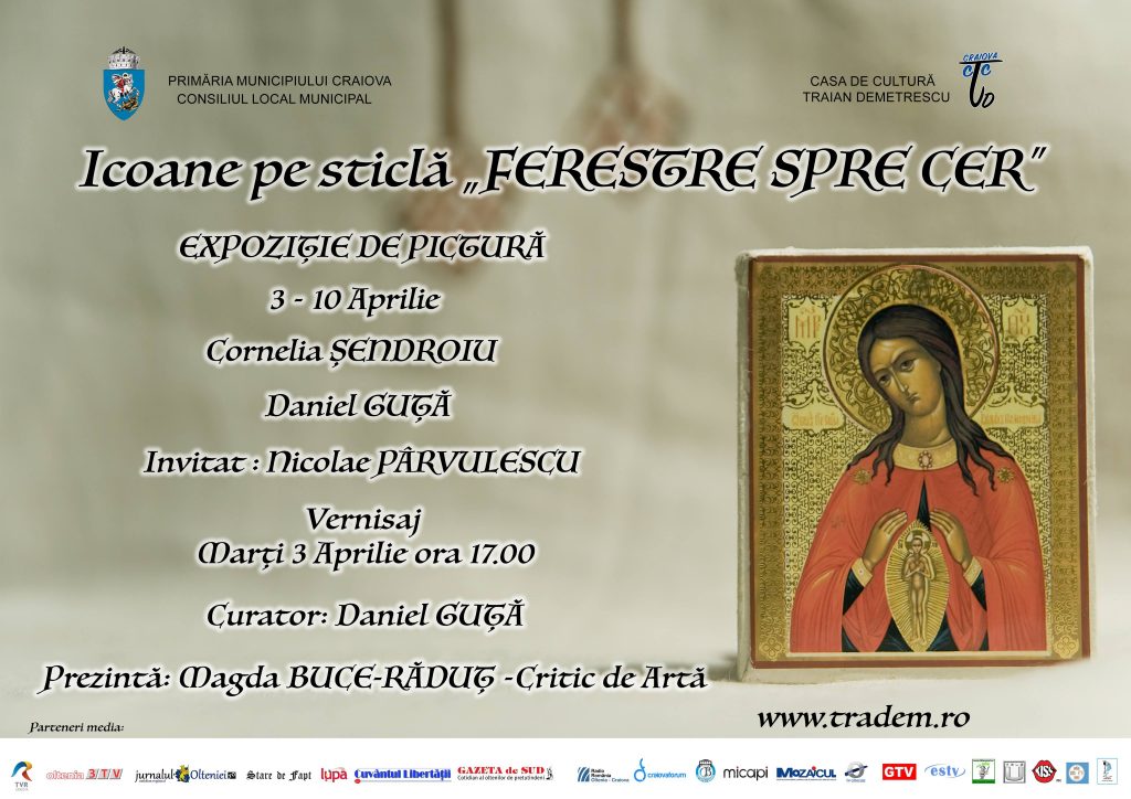 Casa de Cultură „Traian Demetrescu” Craiova organizează cu ocazia sărbătorilor pascale, la sediul său din strada Traian Demetrescu, nr. 31, Galeria Vollard, în perioada 03-10 aprilie 2018, expoziţia de pictură – icoane pe sticlă „Ferestre spre cer”.