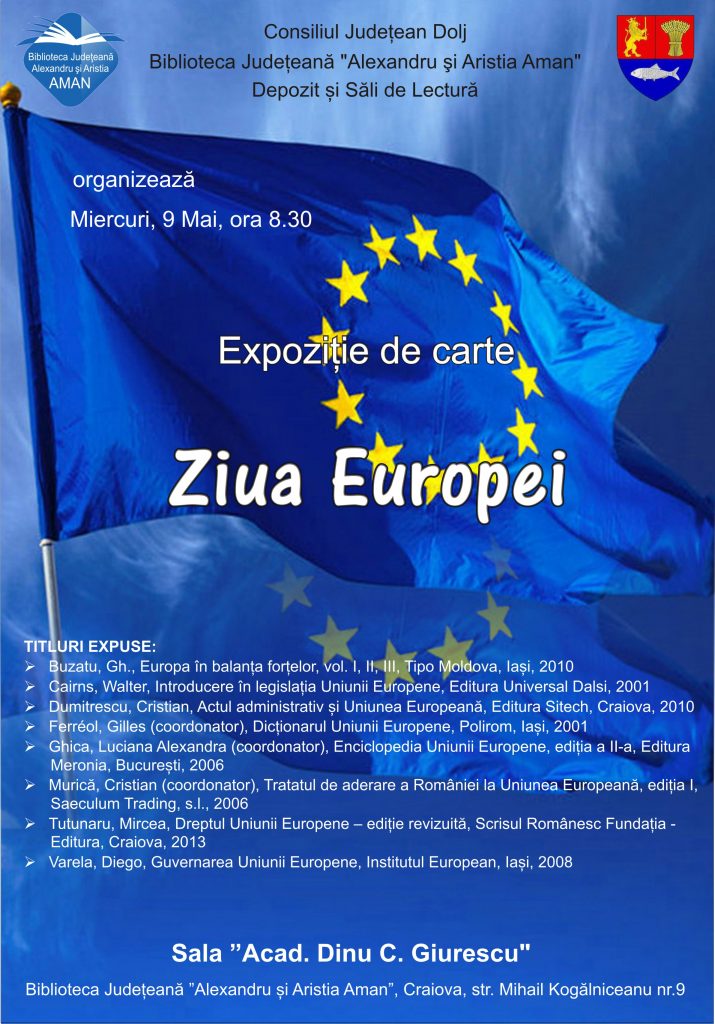 Expoziția cu titlul „Ziua Europei” va conține peste 20 de volume în care se regăsesc fragmente de istorie, dar și alte informații importante referitoare la Uniunea Europeană. Printre volumele care vor fi expuse în cadrul expoziției se află: Buzatu, Gh., Europa în balanța forțelor, vol. I, II, III, Tipo Moldova, Iași, 2010, Cairns, Walter, Introducere în legislația Uniunii Europene, Editura Universal Dalsi, 2001, Dumitrescu, Cristian, Actul administrativ și Uniunea Europeană, Editura Sitech, Craiova, 2010, Ferréol, Gilles (coordonator), Dicționarul Uniunii Europene, Polirom, Iași, 2001, Ghica, Luciana Alexandra (coordonator), Enciclopedia Uniunii Europene, ediția a II-a, Editura Meronia, București, 2006, Murică, Cristian (coordonator), Tratatul de aderare a României la Uniunea Europeană, ediția I, Saeculum Trading, s.l., 2006, Tutunaru, Mircea, Dreptul Uniunii Europene – ediție revizuită, Scrisul Românesc Fundația – Editura, Craiova, 2013, Varela, Diego, Guvernarea Uniunii Europene, Institutul European, Iași, 2008.