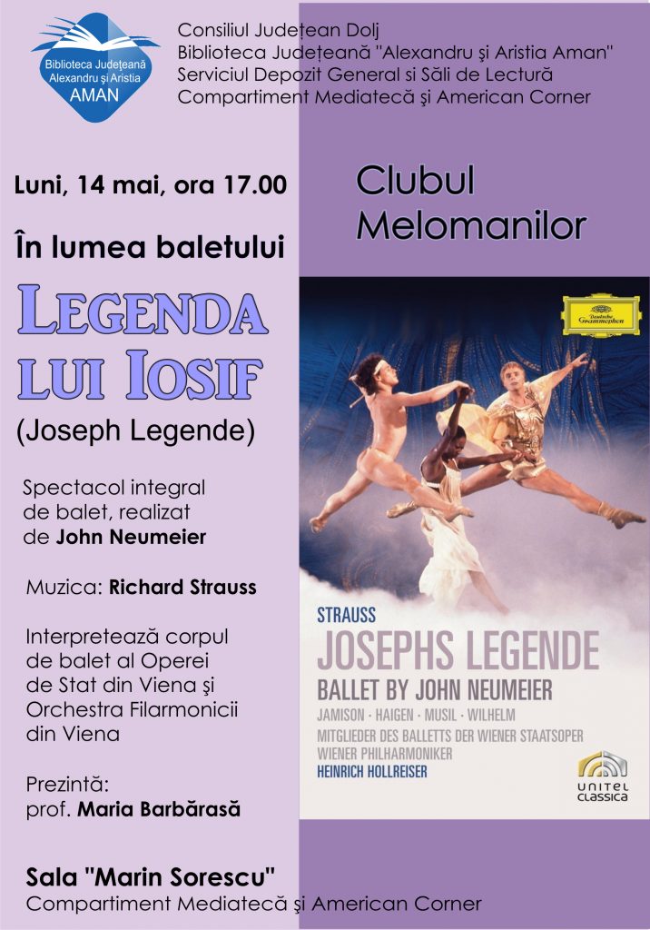 Începând cu ora 17.00, în sala „Marin Sorescu”, vom viziona și asculta spectacolul integral de balet, intr-un act „Legenda lui Iosif”( Joseph Legende) realizat de John Neumeier. Interpreteaza corpul de balet al Operei de Stat din Viena si Orchestra Filarmonicii din Viena , iar muzica este semnată de Richard Strauss.