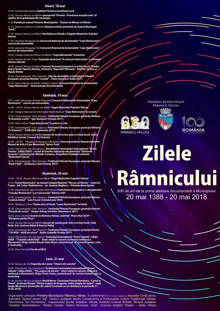 „Printre elementele cele mai importante ale ”Zilelor Râmnicului 2018” se numără Şedinţa festivă a Consiliului Local de vineri, 18 mai, de la ora 10.00 – ce va fi urmată de o paradă festivă până la Statuia lui Mircea cel Bătrân şi de un moment artistic prezentat de actorii Teatrului Municipal ”Ariel”, Târgul Meşterilor Populari Vâlceni (18 – 20 mai, în Scuarul Mircea cel Bătrân), Festivalul Filmului European (18 – 20 mai, la Cinematograful ”Geo Saizescu”), Festivalul Internaţional ”Tinere Talente” (19 – 21 mai, Filarmonica ”Ion Dumitrescu”), ”Caravana Fimului Românesc – Cartea şi Filmul” (21 – 25 mai, Scuarul Mircea cel Bătrân), expoziţii sau întreceri sportive între care se distinge ”Crosul Râmnicului” din data de 20 mai, de la ora 10.00. Nu vor lipsi concertele din centrul Râmnicului, ce vor atinge toate genurile muzicale: vineri, 18 mai – folclor cu Familia Nuţi şi Vasile Tapotă Lătăreţu, Orchestra ”Rapsodia Vâlceană”, Valentin Sanfira şi Olguţa Berbec, sâmbătă, 19 mai – etno-pop cu Sylvie, Mădălina Cernat, Connect-R şi Antonia şi duminică, 20 mai – pop-rock cu Cally Roda, Aris, Andreea Bălan & Band şi Voltaj şi nici focul de artificii ce va fi lansat din zona centrală duminică, 20 mai, la ora 22.00. Primăria municipiului mulţumeşte tuturor partenerilor care şi-au adus contribuţia la realizarea unui astfel de program dens şi complex şi îi invită pe râmniceni să ia parte la toate manifestările pregătite pentru principala sărbătoare identitară a oraşului”, transmit reprezentanții Primăriei.