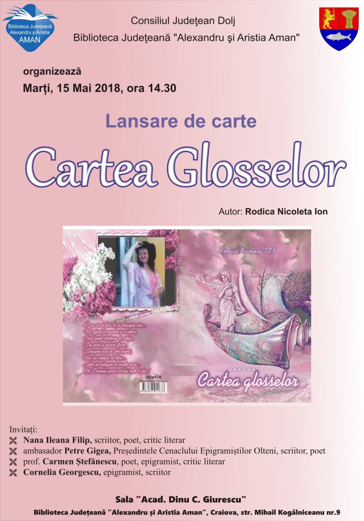 Biblioteca Județeană „Alexandru și Aristia Aman” organizează marți, 15 mai 2018, ora 14.30, în sala „Academician Dinu C. Giurescu”, lansarea volumului „Cartea Gloselor”, de Rodica Nicoleta Ion.