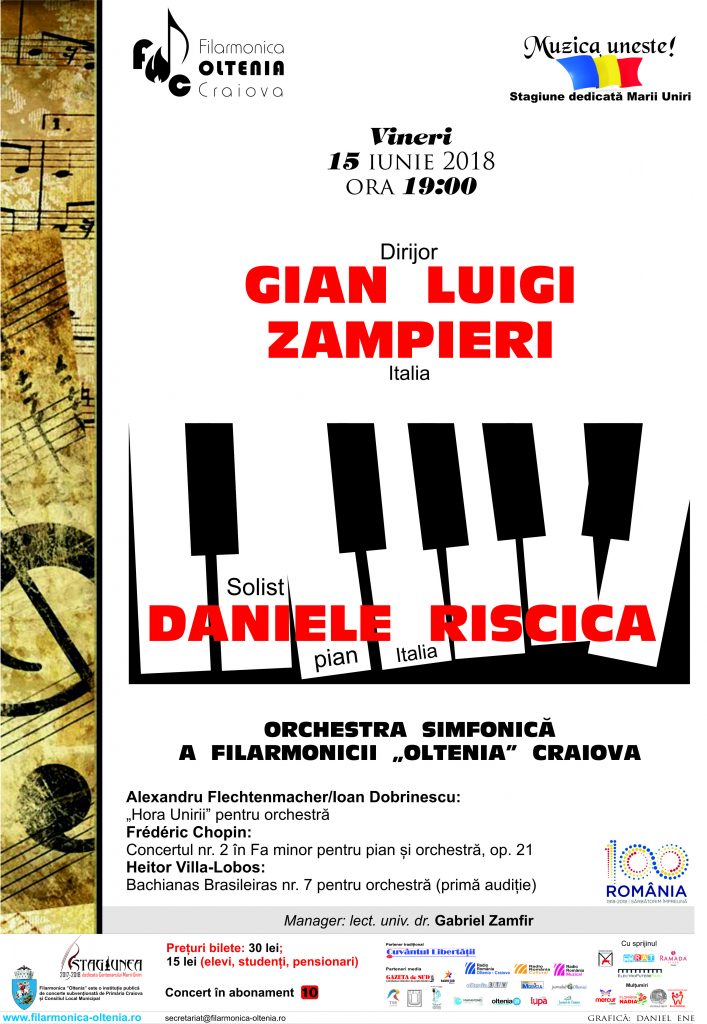 Stagiunea „Muzica uneşte!” a Filarmonicii „Oltenia” Craiova aduce pe aceeaşi scenă vineri, 15 iunie, ora 19, doi artişti italieni. Maestrul Gian Luigi Zampieri şi pianistul Daniele Riscica prezintă un program divers cu muzica românească (Hora Unirii de Flechtenmacher/Ioan Dobrinescu), poloneză (Concertul nr. 2 pentru pian de Chopin) şi braziliană (Bachianas Brasileiras nr. 7 de Villa-Lobos).