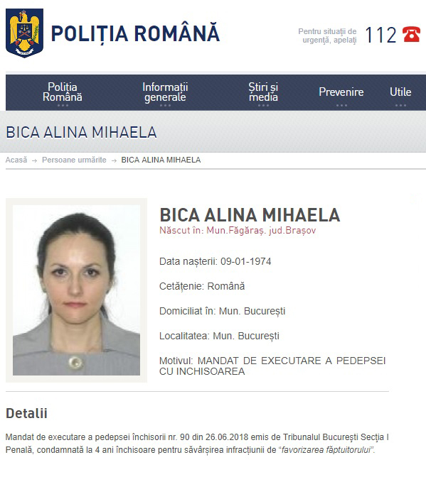 Decizia privind condamnarea Alinei Bica a fost dată, marți, de magistrații Înaltei Curți de Casație și Justiție, iar, miercuri, Poliția Română a anunțat că aceasta a fost dată în urmărie generală, pe site-ul instituției fiind publicată o fotografie a ei.