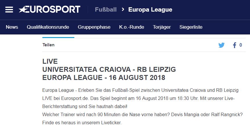 Pe site-un său, Eurosport Germania anunță că va da LIVE partida de pe Oblemenco, dintre CSU Craiova și RB Leipzig. Cum presa centrală din România a anunțat că sunt șanse minuscule să fie televizat, rezultă că este posibil ca meciul să nu fie produs de nicio televiziune. În acest caz este plauzibil ca Eurosport doar să anunțe în timp real pe site-ul propriu evenimentele de la meci.