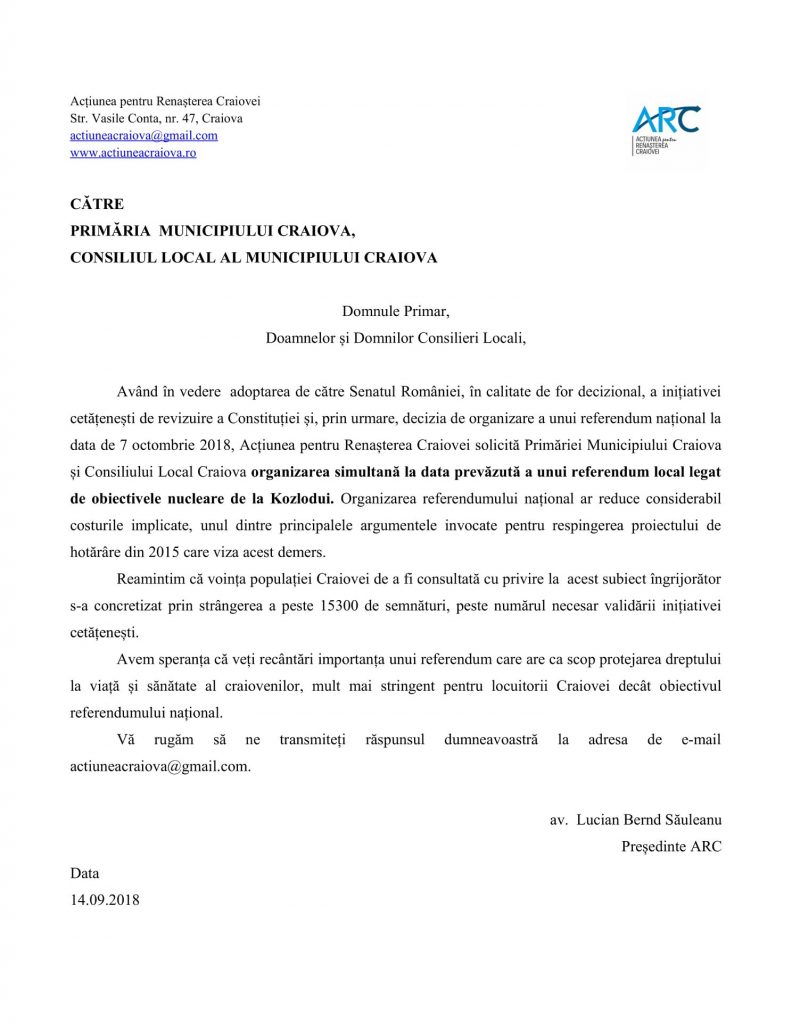 Acțiunea pentru Renașterea Craiovei solicită autorităților locale organizarea unui referendum local privind obiectivele nucleare de la Kozlodui simultan cu referendumul național pentru redefinirea familiei, anunțat pentru data de 7 octombrie 2018.