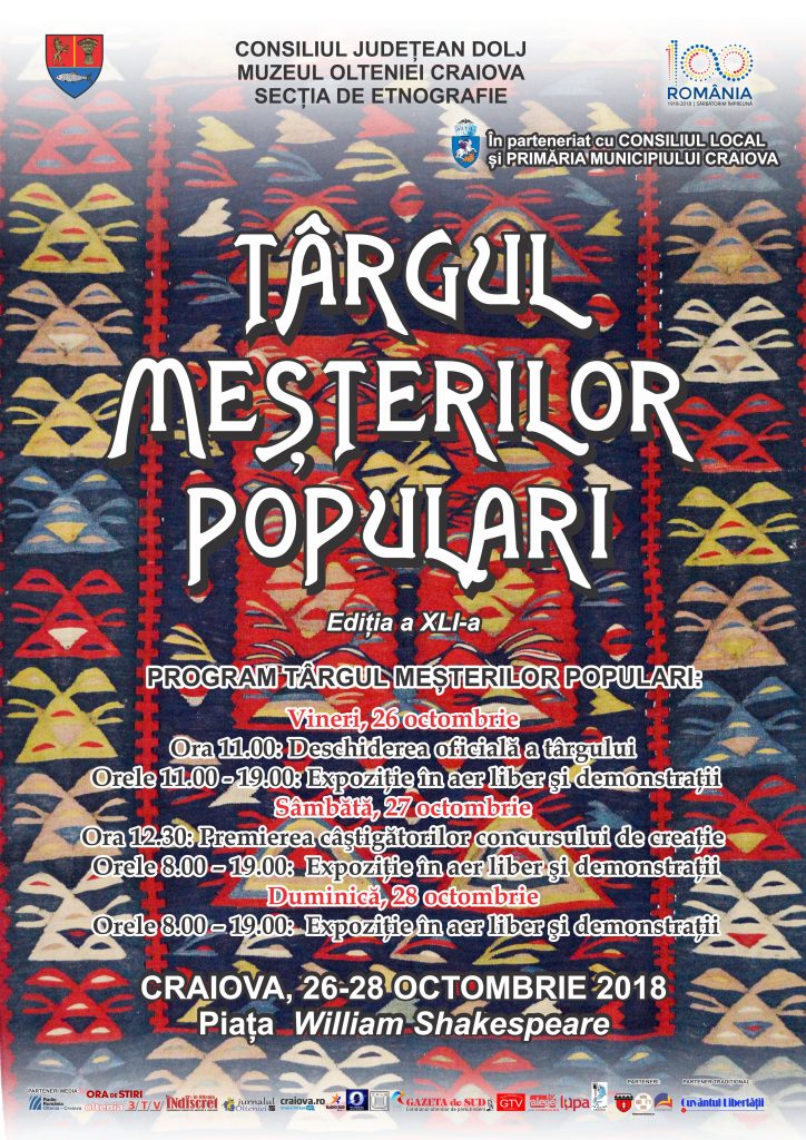 În an centenar, Muzeul Olteniei Craiova, prin Secția de Etnografie, cu sprijinul Consiliului Județean Dolj, și, în parteneriat cu Consiliul Local şi Primăria Municipiului Craiova, organizează în perioada 26-28 octombrie 2018, în Piața „William Shakespeare” din Craiova, a XLI-a ediție a Târgului Meșterilor Populari, sinteză a tradițiilor și spiritualității populare românești, ce va reuni în Cetatea Băniei circa 60 de meșteri populari din principalele zone etnografice și geografice ale României – Oltenia, Muntenia, Dobrogea, Banat, Crișana, Maramureș, Țara Oașului, Țara Făgărașului, Țara Bârsei etc.