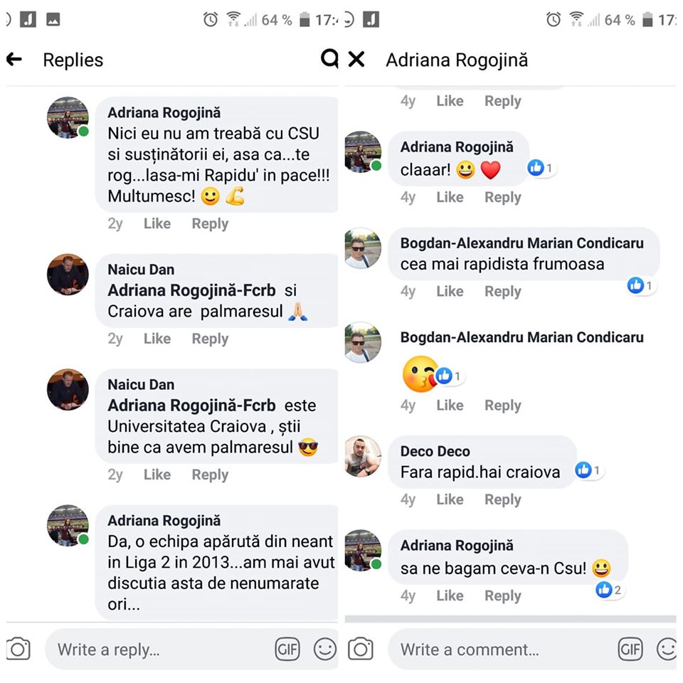 Paharul s-a umplut marți seară, când clubul oltean a anunțat că-și face echipă de fotbal feminin, iar la conducerea acesteia a instalat-o pe Adriana Rogojină. Acesta a fost fitilul care a declanșat un scandal monstru în Bănie. Adriana e suporteriță feroce a celor de la Rapid București, dar până la urmă fiecare ține cu cine vrea. Problema majoră o constituie faptul că în trecut, Adriana Rogojină nu a pierdut nicio ocazie să jignească și să batjocorească CSU Craiova. În mod firesc, fanii au reacționat după anunțul clubului, prin postarea unor colaje cu comentariile fetei, majoritatea jignitoare la adresa clubului. Despre proiectul lui Rotaru, fata scria: „O echipă apărută din neant în Liga 2 în 2013! Să ne băgăm ceva-n CSU!”