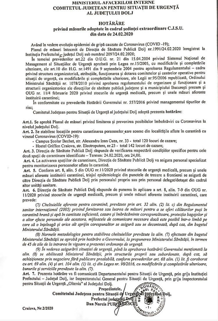 Dolj. 24 februarie 2020, ora 22.31 – Opt persoane în carantină. Secretarul de stat Raed Arafat a declarat în această seară că în judeţul Dolj sunt opt persoane în carantină care au fost în zona Lodi, Lombardia şi s-au întors în ţară. Prefectul de Dolj susţine că sunt 30 de persoane în izolare voluntară la domiciliu. Acestea au venit în ţară cu mijloace auto. Cât despre carantină: „Nu avem absolut nici o persoană în carantină în judeţul Dolj.”