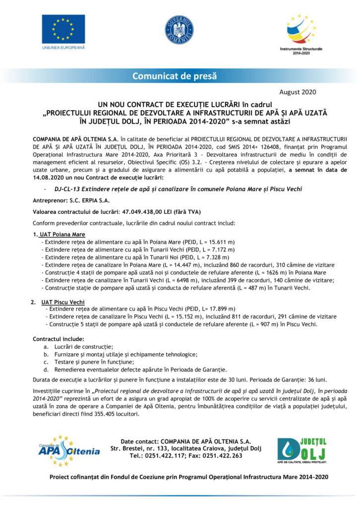ActualitateDoljOlteniaUN NOU CONTRACT DE EXECUȚIE LUCRĂRI în cadrul „PROIECTULUI REGIONAL DE DEZVOLTARE A INFRASTRUCTURII DE APĂ ȘI APĂ UZATĂ ÎN JUDEȚUL DOLJ, ÎN PERIOADA 2014-2020” s-a semnat astăzi Jurnalul Olteniei 14 august 2020 Share SHARE Jurnalul Olteniei See Full Bio TAGGED:CAOcompania de apa olteniainfrastructura Distribuie acest articol Facebook Whatsapp Whatsapp Email Copy Link Print Articolul precedent INS: Economia României a scăzut cu 12,3% Articolul următor ANPC: Dezinfectant de mâini toxic, în magazine Ultima ora Atac violent în trafic la Târgu Jiu: tânăr reținut după ce a agresat un pasager din taxi 15 decembrie 2025 Medicul craiovean Dominic Iliescu, premiat de Academia Română 15 decembrie 2025 CS Vâlcea 1924, învinsă din nou după prelungiri. CSM Târgu Mureș câștigă la limită în Zăvoi 15 decembrie 2025 Madrigal de Crăciun: Spectacol – eveniment la Craiova 15 decembrie 2025 Direcția Județeană pentru Cultură Vâlcea propune Calendarul Cultural 2026 – un parcurs al memoriei colective, de la evenimente fondatoare la personalități care au marcat cultura locală și națională 15 decembrie 2025 Incendiu la o gospodărie din Câineni. Pompierii au salvat două locuințe și trei clăi de fân 15 decembrie 2025 Ministrul Economiei atacă dur Avioane Craiova 15 decembrie 2025 Cobza, simbol al tradiției românești, în patrimoniul UNESCO 15 decembrie 2025 Universitatea Craiova câștigă la Sibiu și se apropie la doar două puncte de primul loc 14 decembrie 2025 Impozitele pe locuințe cresc din 2026: Calcule și majorări 14 decembrie 2025