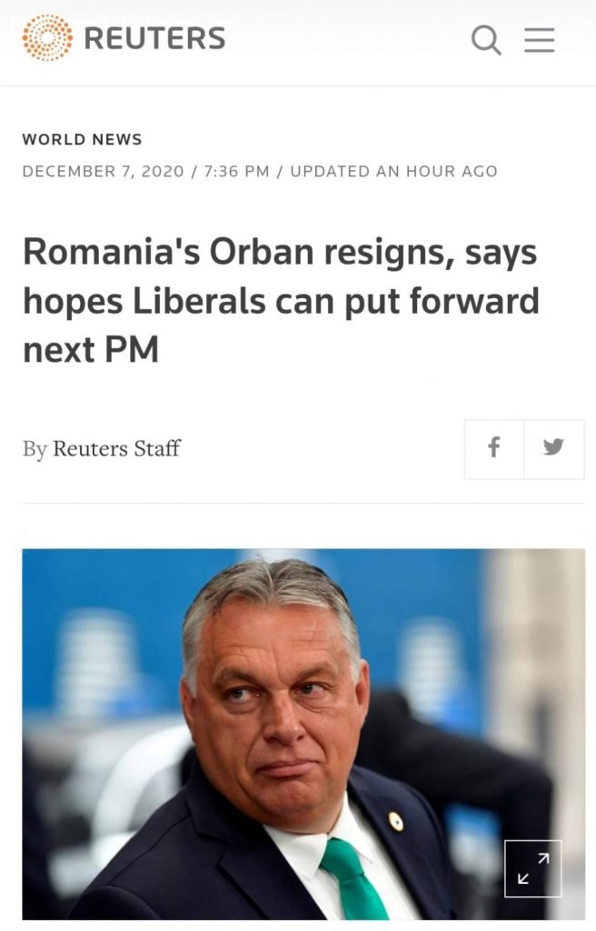 Agenția de presă Reuters a publicat fotografia premierului Ungariei Viktor Orban și știrea pe care a publicat-o despre demisia premierului român Ludovic Orban.