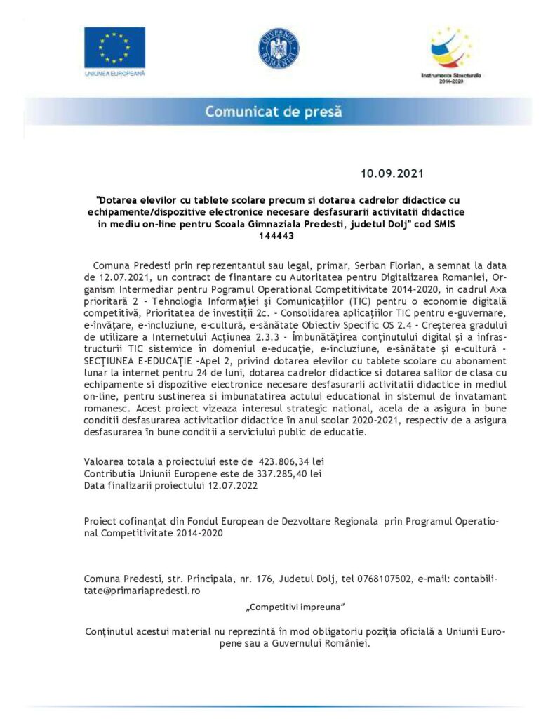 DoljEconomie„Dotarea elevilor cu tablete scolare precum si dotarea cadrelor didactice cu echipamente/dispozitive electronice necesare desfasurarii activitatii didactice in mediu on-line pentru Scoala Gimnaziala Predesti, judetul Dolj” cod SMIS 144443 Jurnalul Olteniei 13 septembrie 2021 Share SHARE Jurnalul Olteniei See Full Bio Distribuie acest articol Facebook Whatsapp Whatsapp Email Copy Link Print Articolul precedent Doi doljeni, arestați fiindcă au obligat două tinere să se prostitueze! Articolul următor Florin Cîțu, susținut de PNL Dolj la șefia partidului Ultima ora Salonul Anual de Artă 2025, eveniment major în Mehedinți 13 decembrie 2025 Ștefan Hrușcă vine în premieră la Târgul de Crăciun Craiova 13 decembrie 2025 Tragedie în Gorj: pieton ucis într-un accident violent 13 decembrie 2025 Protest la Craiova pentru justiție și împotriva corupției 12 decembrie 2025 Alertă alimentară: Lapte NAN Nestlé retras urgent din magazine 12 decembrie 2025 Cadouri cool de Crăciun pentru adolescenți 12 decembrie 2025 Satul oltenesc la Craiova. Tradiții de iarnă 12 decembrie 2025 Premieră medicală la Spitalul Craiova: Procedură fără tăieturi pentru o boală rară a esofagului 12 decembrie 2025 Editura Nemira lansează un experiment A.I. care arată cum i-ar putea afecta pe adolescenți noua programă pentru pentru limba și literatura română propusă de Ministerul Educației și Cercetării 12 decembrie 2025 Polițist din Dolj, reținut pentru luare de mită: „Ierta” vitezomanii în schimbul banilor 12 decembrie 2025