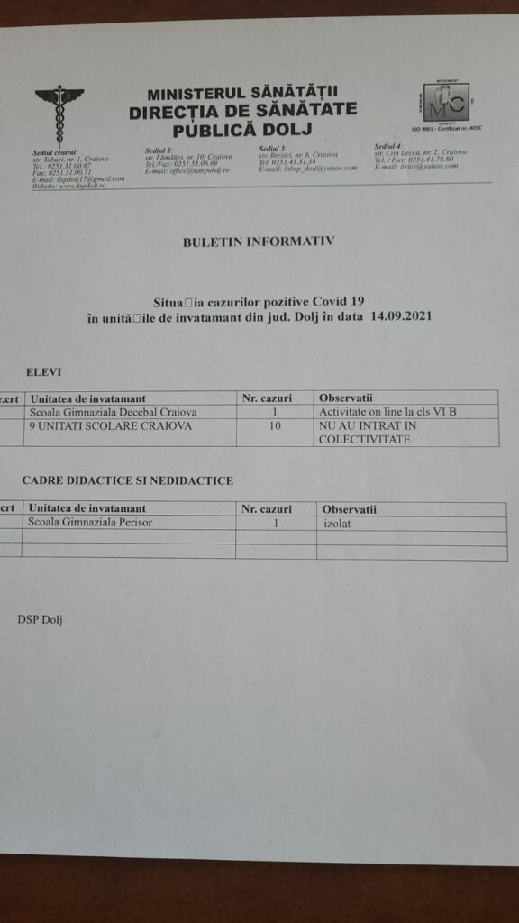 Nici n-a început școala bine că numărul cazurilor de COVID-19 a început să crească. Potrivit unei raportări DSP privind situația cazurilor pozitive COVID-19 în unitățile de învățământ din județul Dolj, 10 elevi din 9 școli din Craiova au fost găsiți pozitivi, însă nu au intrat în colectivitate. La Școala Gimnazială Decebal a fost înregistrat un caz de infectare la un elev, iar activitatea s-a mutat în online la clasa a VI-a B. Și în rândul cadrelor didactice și nedidactice de la Școala Gimnazială Perișor a fost semnalat un caz, însă persoana respectivă a intrat în izolare.